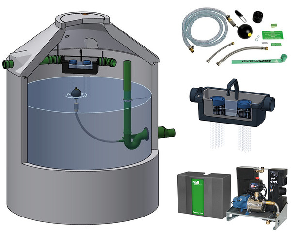 Le pack Mall-Maison Tano L Reto comprend tout ce dont vous avez besoin : citerne Reto avec filtre à fentes pour une surface de toit allant jusqu’à 100 m2, tampon en couverture de classe A 15, gestionnaire des eaux pluviales « Tano » pré-monté, kit de raccordement et prise d’eau flottante.